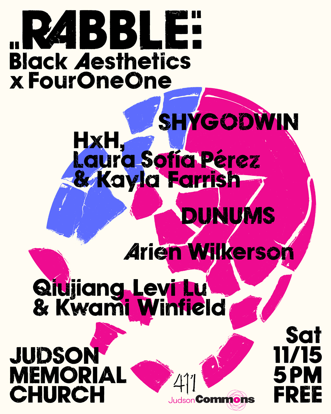 FourOneOne’s working definition of performance, as the embodied means of transmitting the experiential knowledge of communities across generations, geographies and social boundaries, has found a deep sympathetic resonance with Black Aesthetics' mission of centering Black queer, non-binary, and trans artists and highlighting the variegated perspectives and experiences within those communities. We intend to create space for voices from communities that find themselves living in many different “Americas,” while also facilitating/provoking their intermingling. The two organizations have brought together a group of artists who disrupt not only their own aesthetic habits but also the expectations of the audience as cultural consumers. Hoping to draw audiences into dialogue with different modes of cultural resistance across social and aesthetic divides, RABBLE will showcase the Black, queer and ferociously anticapitalist punk of Philadelphia's ShyGodwin, ambient/improv duo HxH in collaboration with experimental filmmaker Laura Sofía Pérez and dancer/choreographer Kayla Farrish, Palestinian folk songs reimagined by Sijal Nasralla's Durham, NC-based dream pop band Dunums, the animistic feedback ritual of noise-technologists Qiujiang Levi Lu and Kwami Winfield, and an agit-prop dance/electronics set by Black Aesthetics founder/curator Arien Wilkerson.